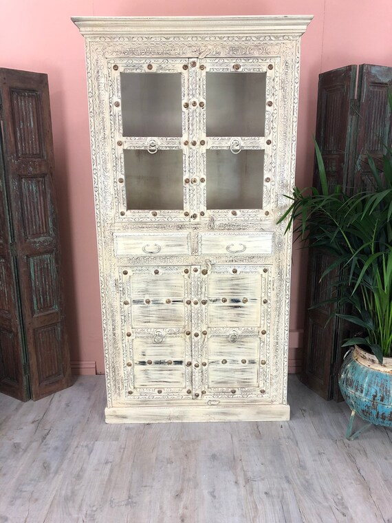 Beautiful Carved Glass Fronted Cabinet Armoire Made From Mango