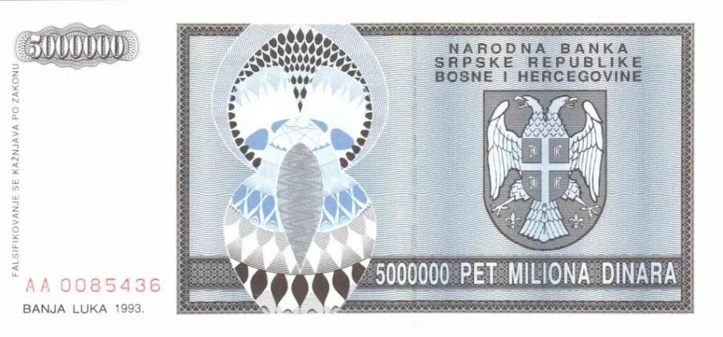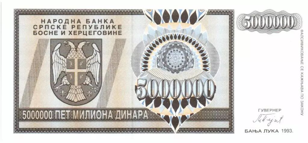 Billet Bosnie Herzegovine 5 000 000 Dinara Marron Armoiries 1993