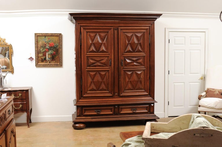 Baroque cabinet 18ème walnut carved 246 cm. La grande armoire double à panneaux ornés de sculptures en pointe de diamant est très caractéristique du style louis xiii. Armoire louis xiii pointe de diamant entièrement restaurée.