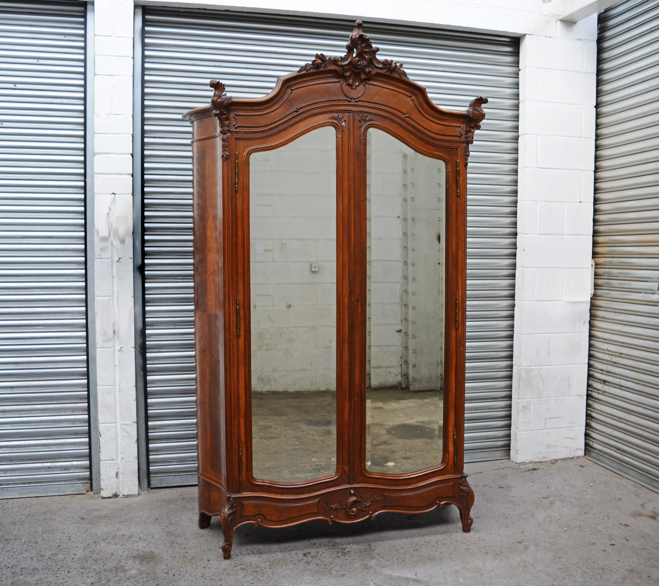 Antique French Double Armoire With Mirrored Doors Carved Wardrobe