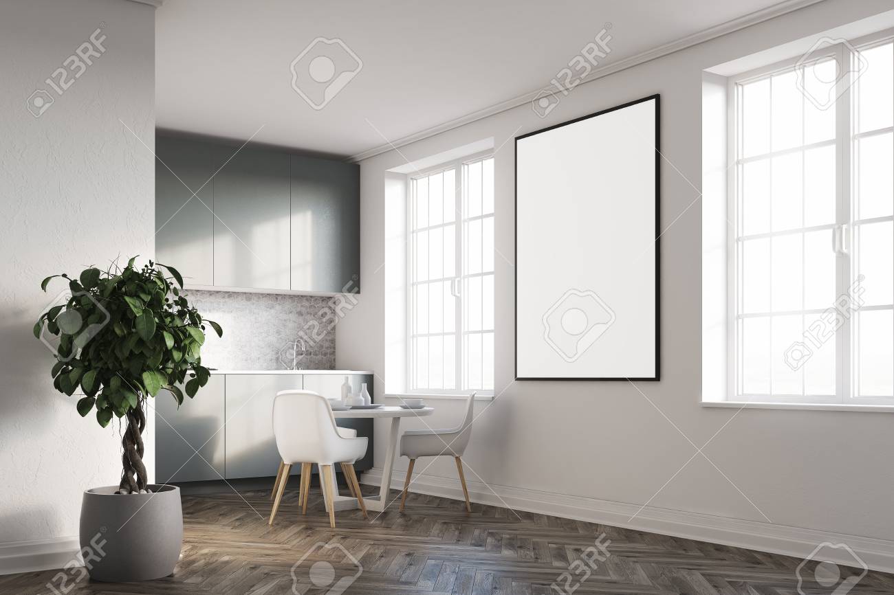 Interieur De Cuisine Blanche Avec Un Plancher En Bois Une Affiche