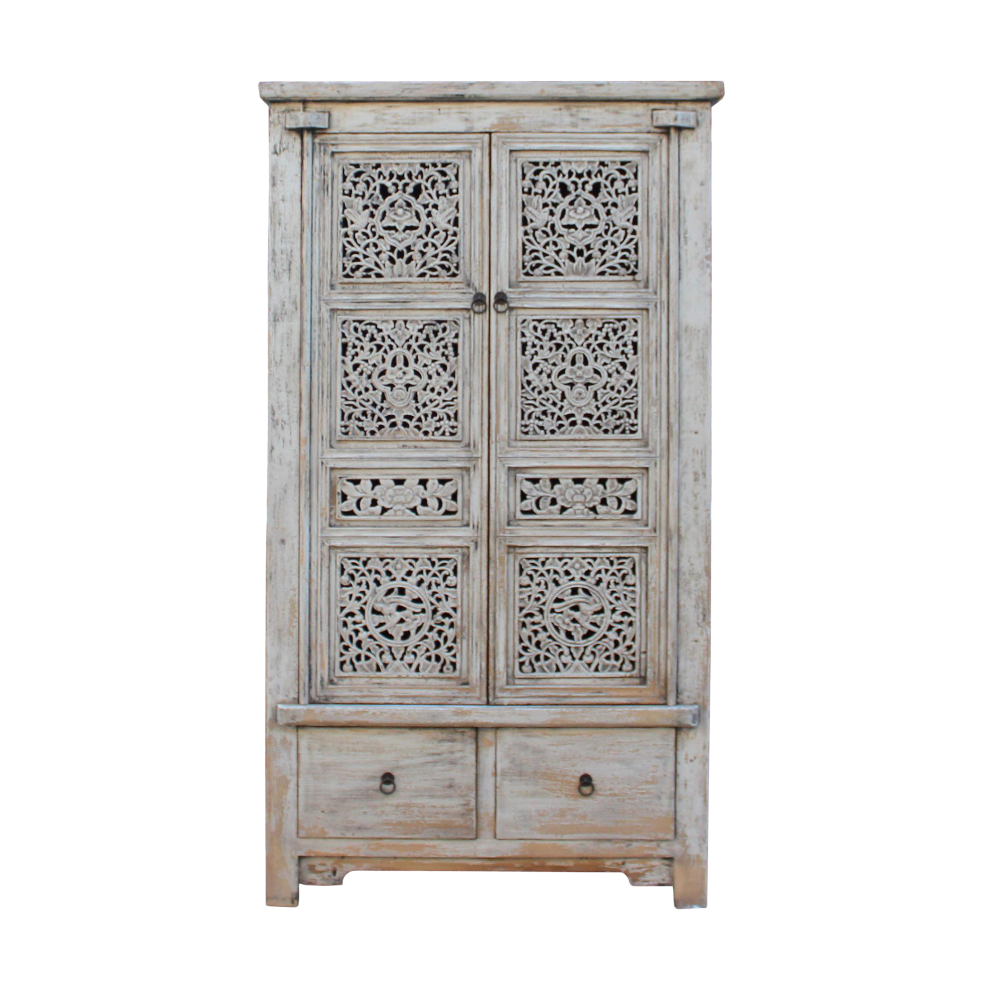 Chinese Distressed Off White Relief Carving Armoire Storage