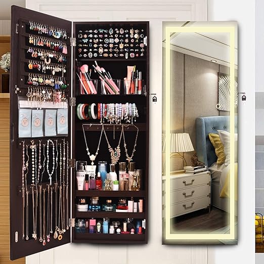 Langria Mirrored Jewelry Armoire With 10 Automatic Led Lights Wall