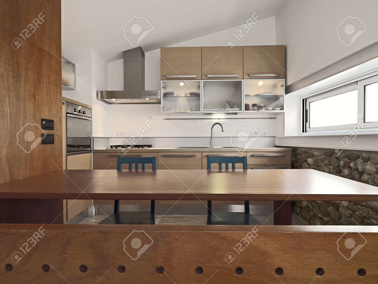 Vue De L Interieur D Une Cuisine Moderne En Bois Avec Ilot Et