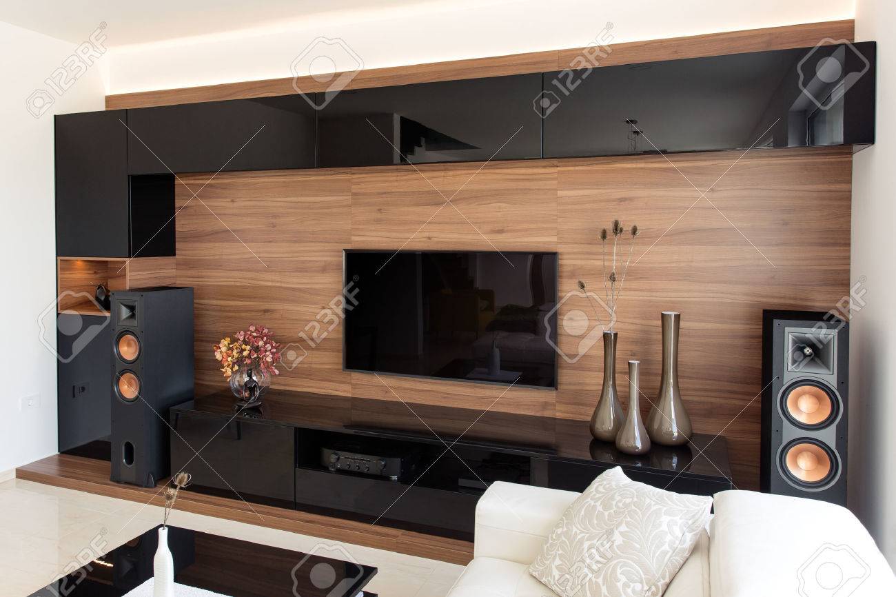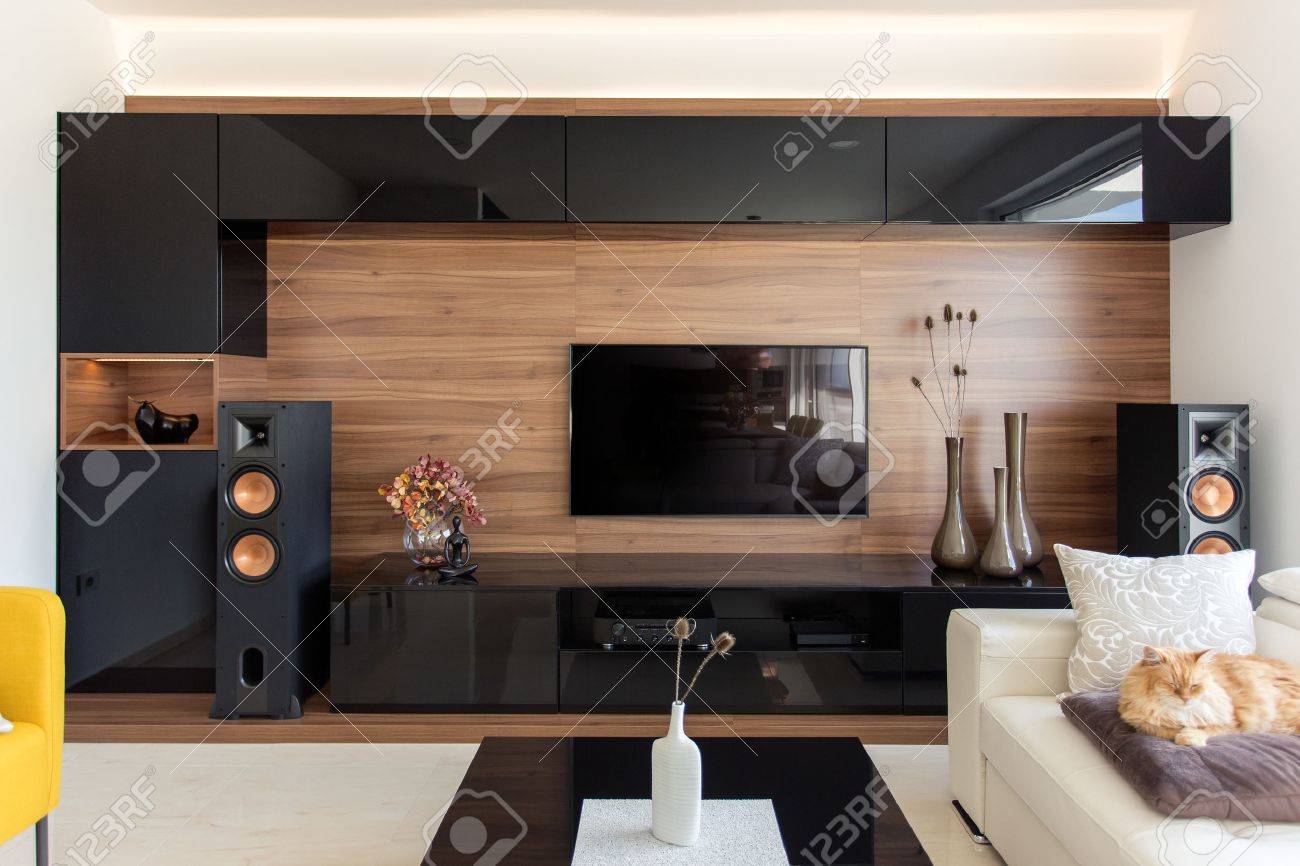 Salon Elegant Avec Des Armoires En Noir Et Chene Banque D Images