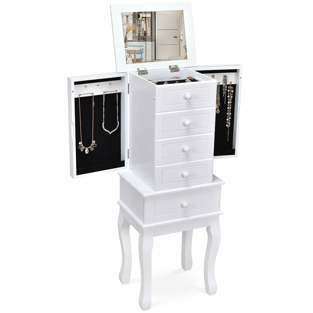 Jewelry Armoire Stand White Wood Mirrored Box Tall Storage Chest
