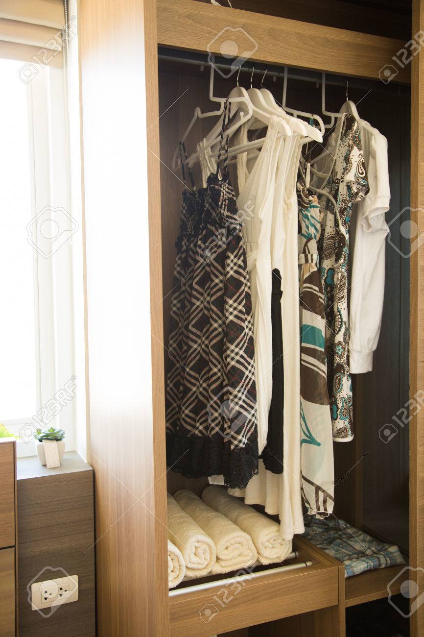 Cabinet Moderne Avec La Rangee Des Tissus Accrochant Dans La Garde