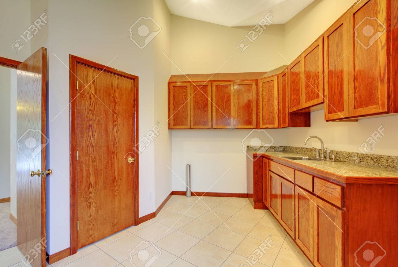 Petite Salle De Cuisine Interieure Avec Brun Armoires De Rangement