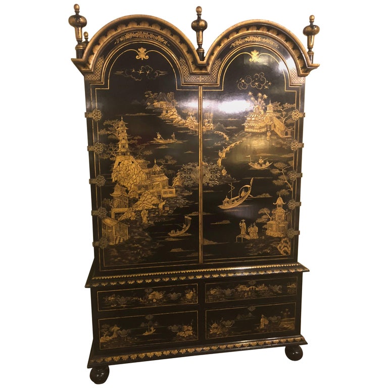 Palatial Chinoiserie Decorated Ebonized Two Door Over Four Drawer