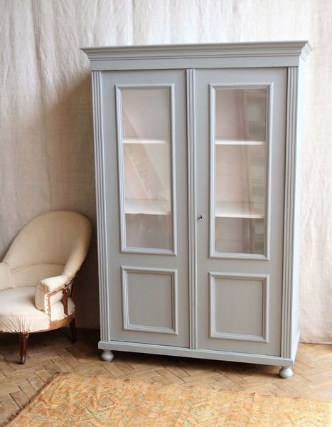 Vintage Antique Grey Painted Larder Linen Press Glass Cupboard
