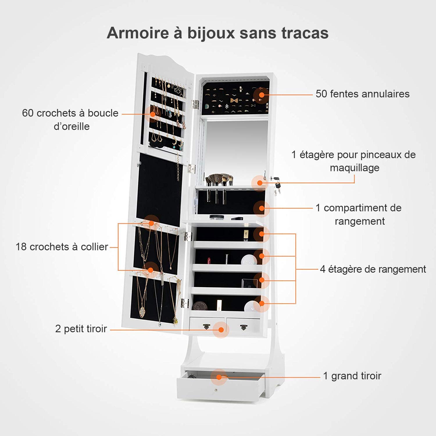 Armoire A Bijoux Sur Pied Avec Miroir Accesoires Collier Coffre A