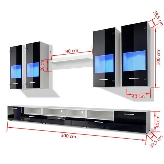 Meuble Tv A Vitrine Murale Noir Avec Lumiere Led Bleu 8 Pieces