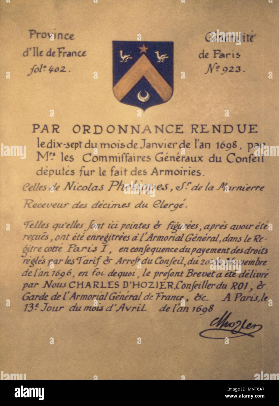 Francais Brevet D Armoiries De Nicolas Phelippes Sieur De La