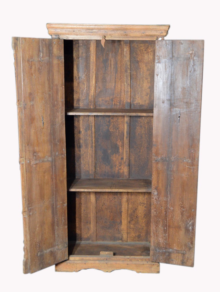 Indian Vintage Wooden Armoire With Metal Braces And Hand Carved
