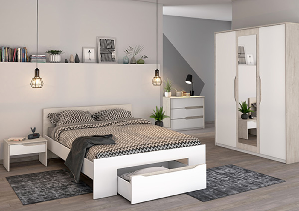 Armoire 2 Portes 2 Tiroirs Miroir Kent Chene Clair Blanc