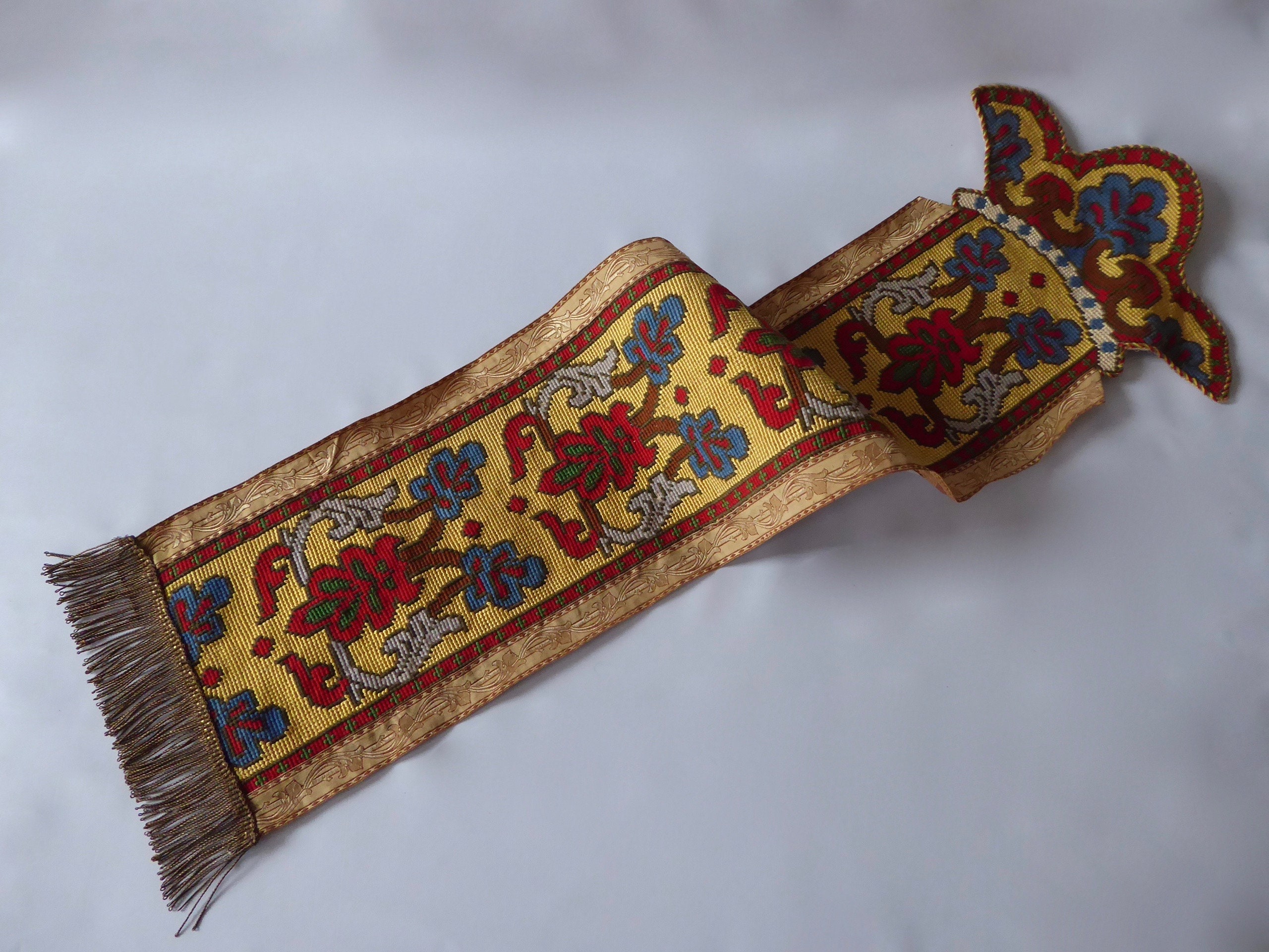 Antique Tapestry Banner Wire Oeillet 19e Century Gilded Trim Ribbon