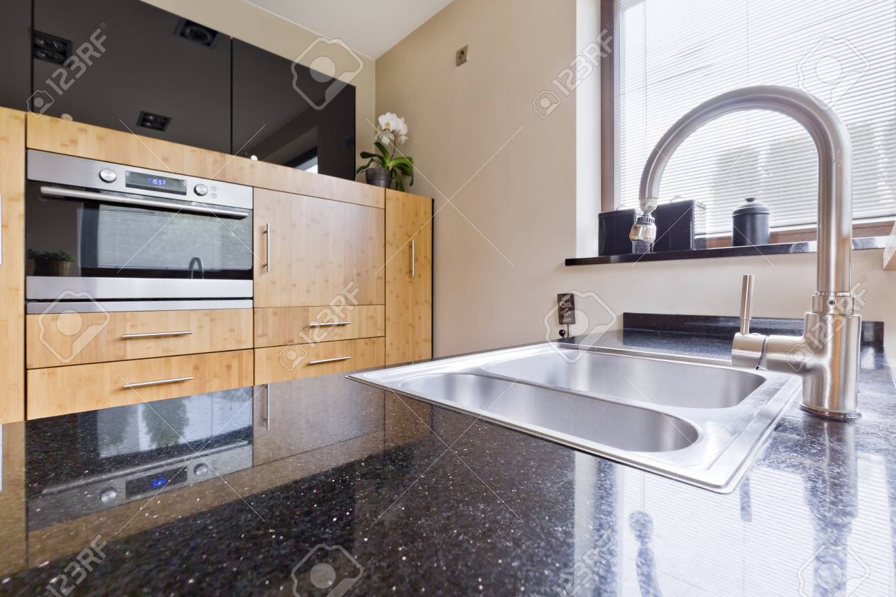 Comptoir De Cuisine Noir Avec Evier En Acier Armoires Encastrees