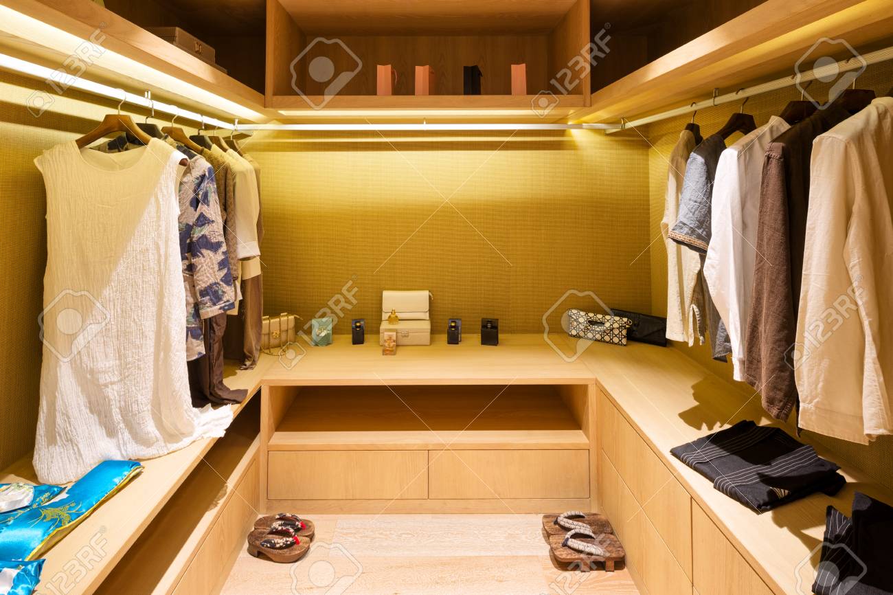 Modern And Stylish Interior Of Bright Wooden Wardrobe Stock Photo