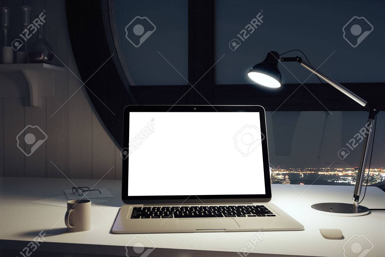 Blank Ecran D Ordinateur Portable Blanc Sur La Table Et La Lampe