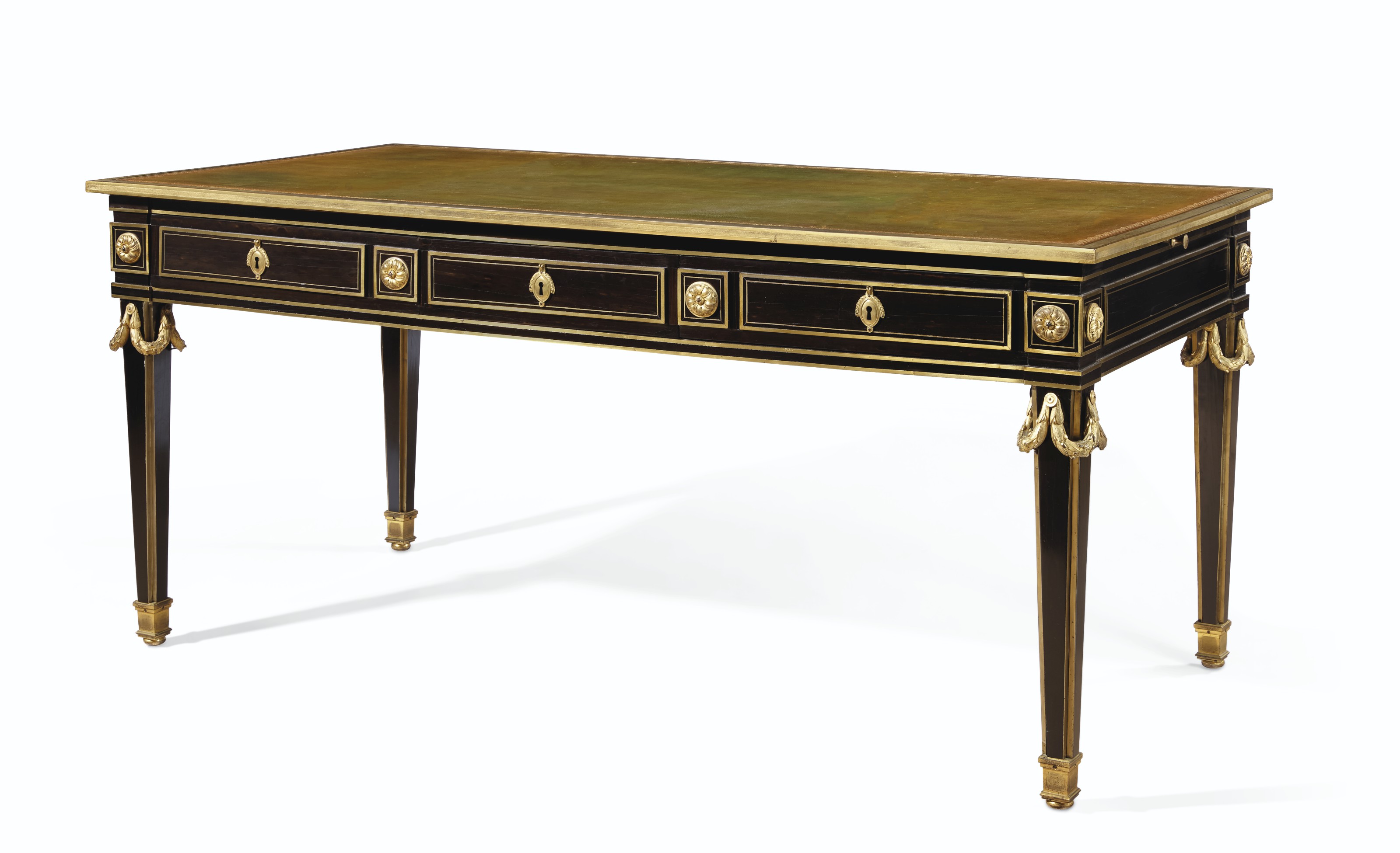 A Louis Xvi Ormolu Mounted And Brass Inlaid Ebony Bureau Plat By