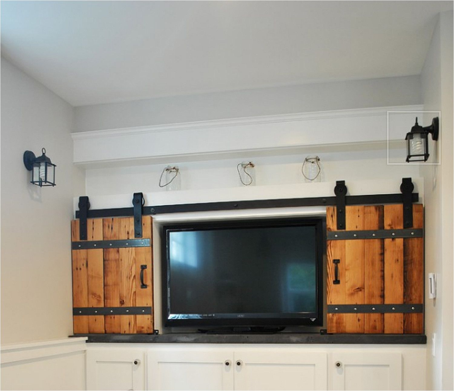 Custom Wooden Tv Frame With Modern Barn Door Style Hardware
