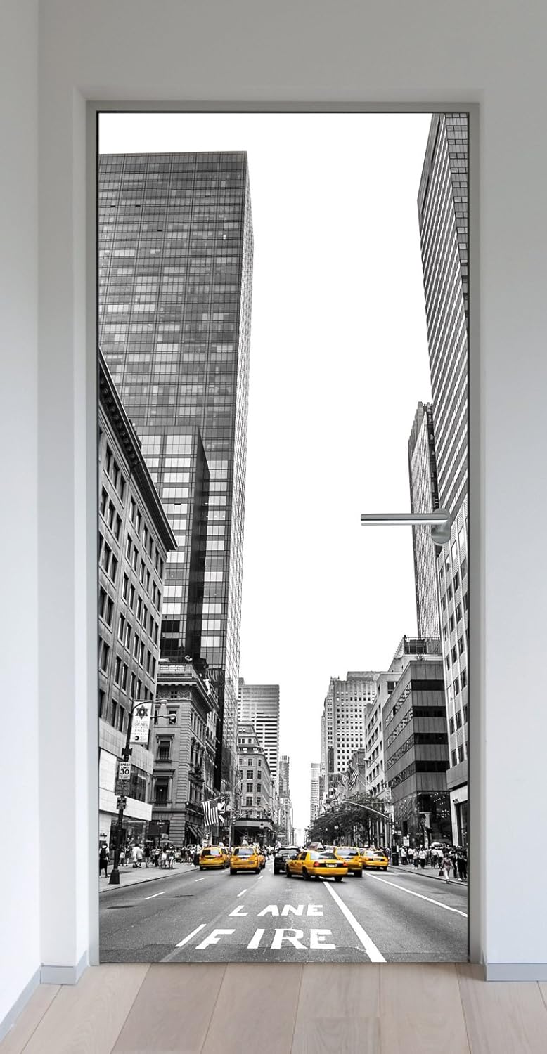 Sp1103 83x204cm Sticker Porte Trompe Oeil Time Square Taxi Noir Et