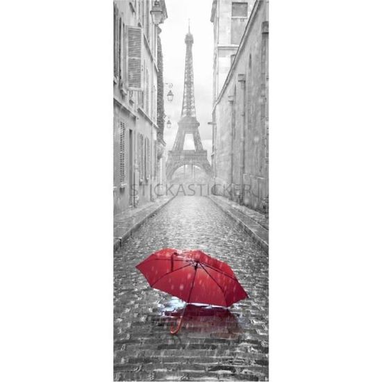 Sp1124 73x204cm Sticker Porte Trompe Oeil Paris Parapluie Rouge