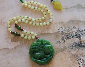 Collier Jadeite Pixiu Sculpte Porte Bonheur Bijoux Artisanal