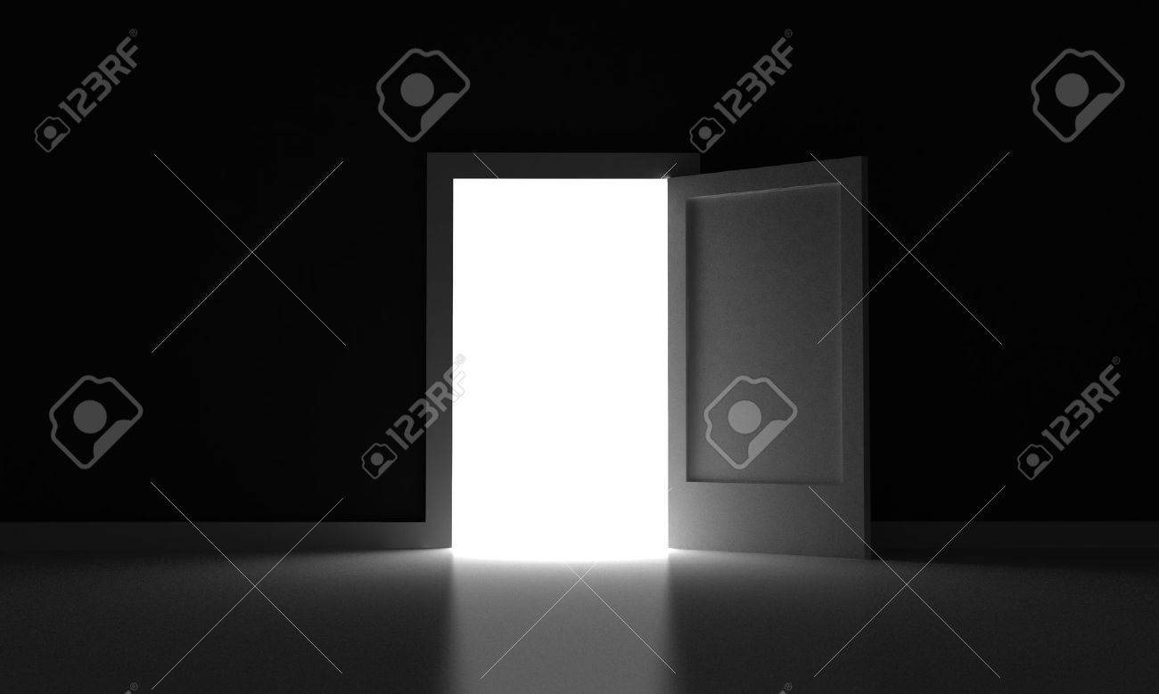 Porte Ouverte A Blanc Lumiere Dans A Salle Sombre Clipart