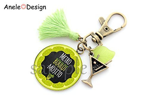 Porte Cles Metro Boulot Mojito Vert Noir Cocktail Pompon Cabochon